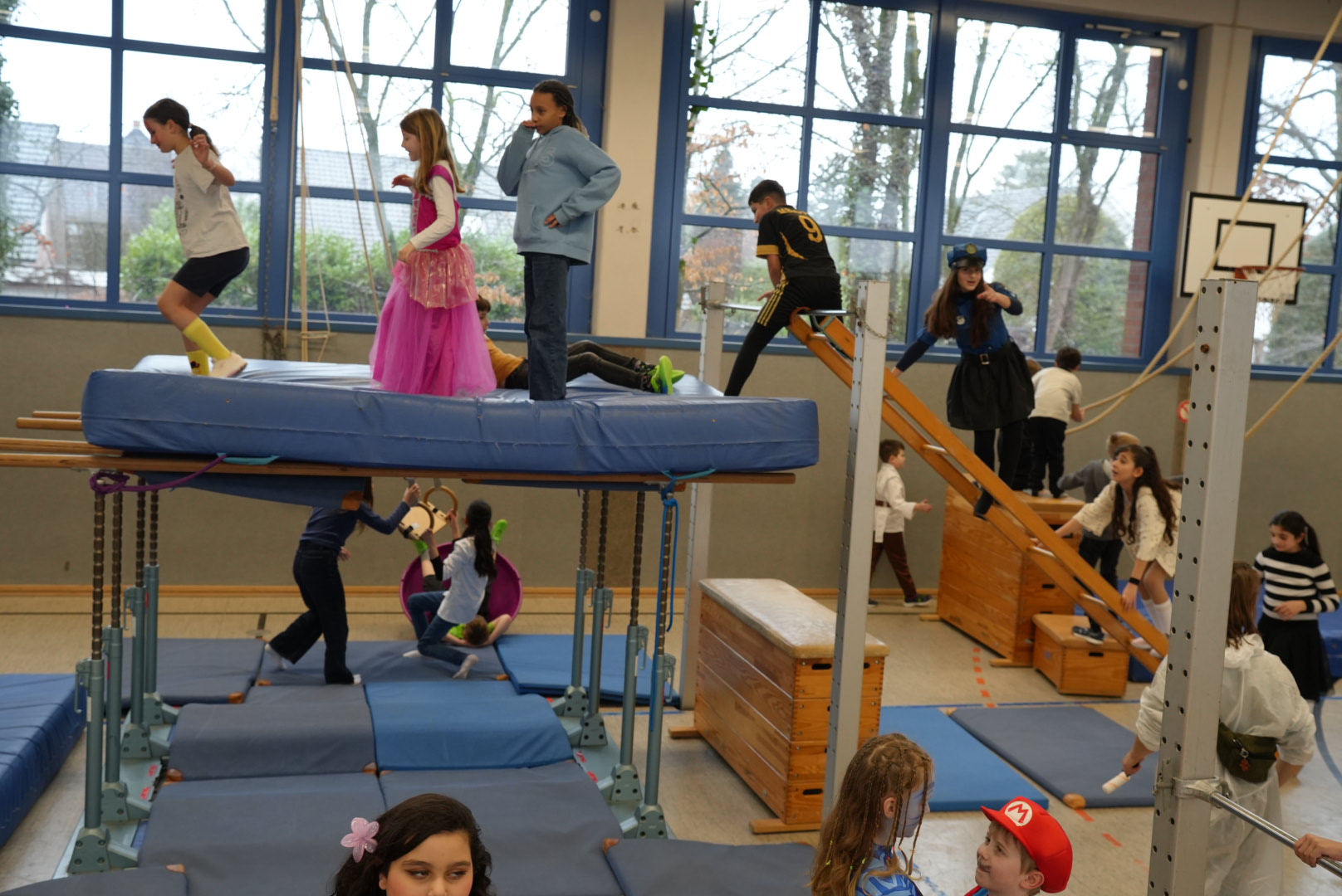 Helau! Auch dieses Jahr wurde Karneval an der ganzen Schule gefeiert: Die Klassen haben gemeinsam gefrühstückt, gespielt und getanzt. In der Turnhalle konnte in den Kostümen geklettert werden und es gab eine gemeinsame Party-Pause für beide Standorte. Auch Kinderschminken wurde angeboten.